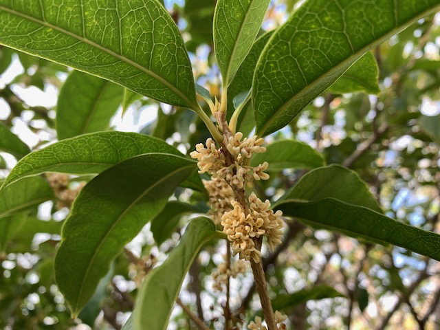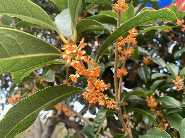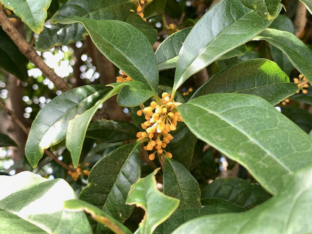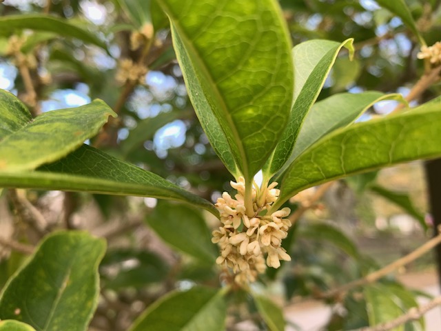 キンモクセイとギンモクセイを見分けるポイントは、花色などの特徴や香りです。花が咲いている時期であれば、色と香りで見分けられます。色が橙色で強い芳香があればキンモクセイ、色が白や黄色でほのかな芳香があればギンモクセイです。公園内のあちこちで見ることが出来ます。