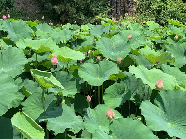 水面から花茎を出して開花するその姿は、城址公園の夏の風物となっています。蓮の花は早朝開きお昼には閉じるというサイクルで、4日目は閉じることなくそのまま花びらを落として散っていきます。午後に咲いている蓮の花があったら、その日を最後に散る花です。大きく丸みを帯びた花は翌日も咲く花です。花は早朝に咲きはじめ、お昼には閉じてしまいます。ぜひ早起きして足を運んでみてください。(8月13日現在、つぼみも花も少なくなり花後の花托(かたく)が目立つようになりました。)
