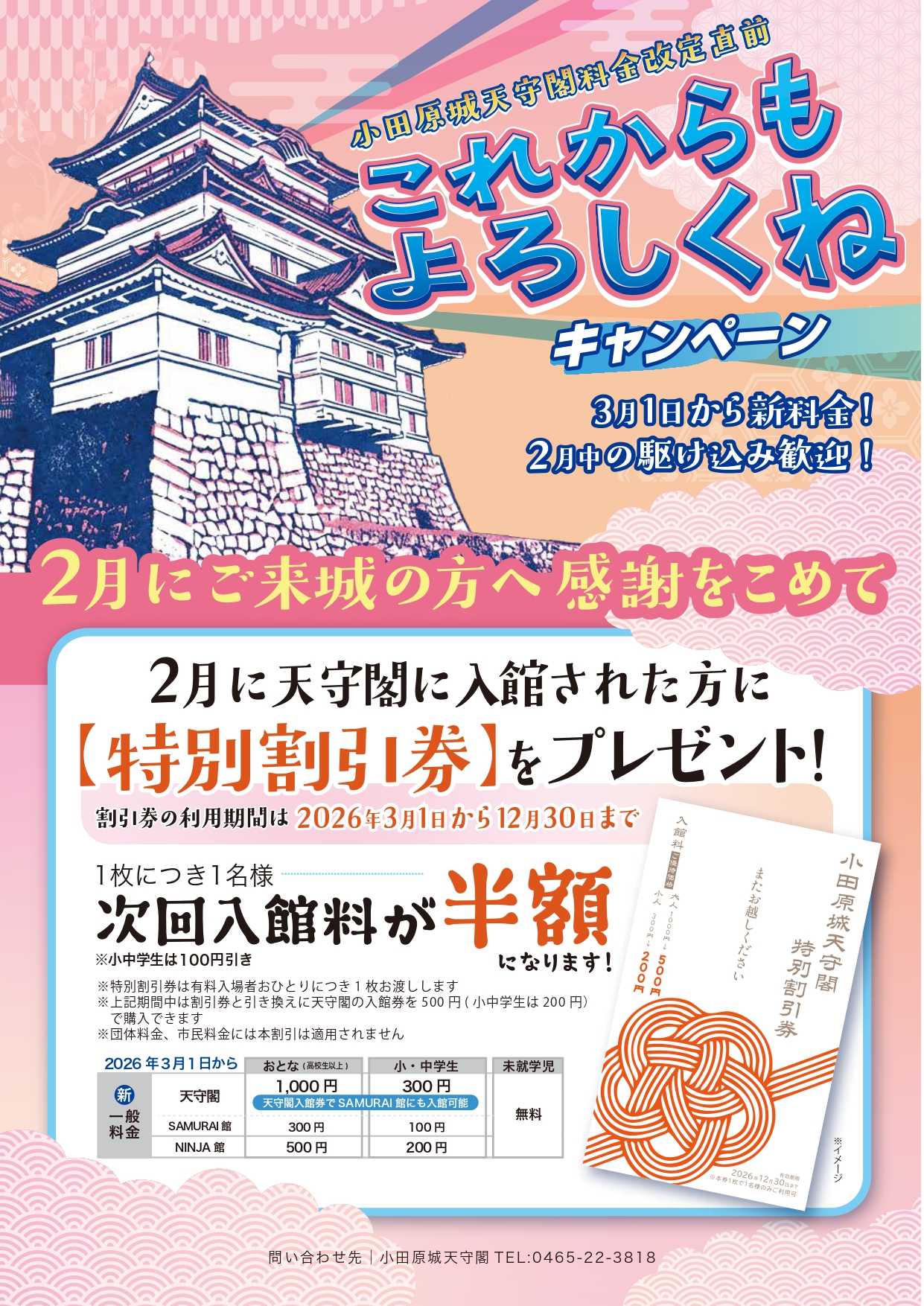 改定直前となる2月中にご来城の方へ、料金改定後にも再来訪していただけるよう期間限定で利用できる特別割引券をプレゼントいたします。