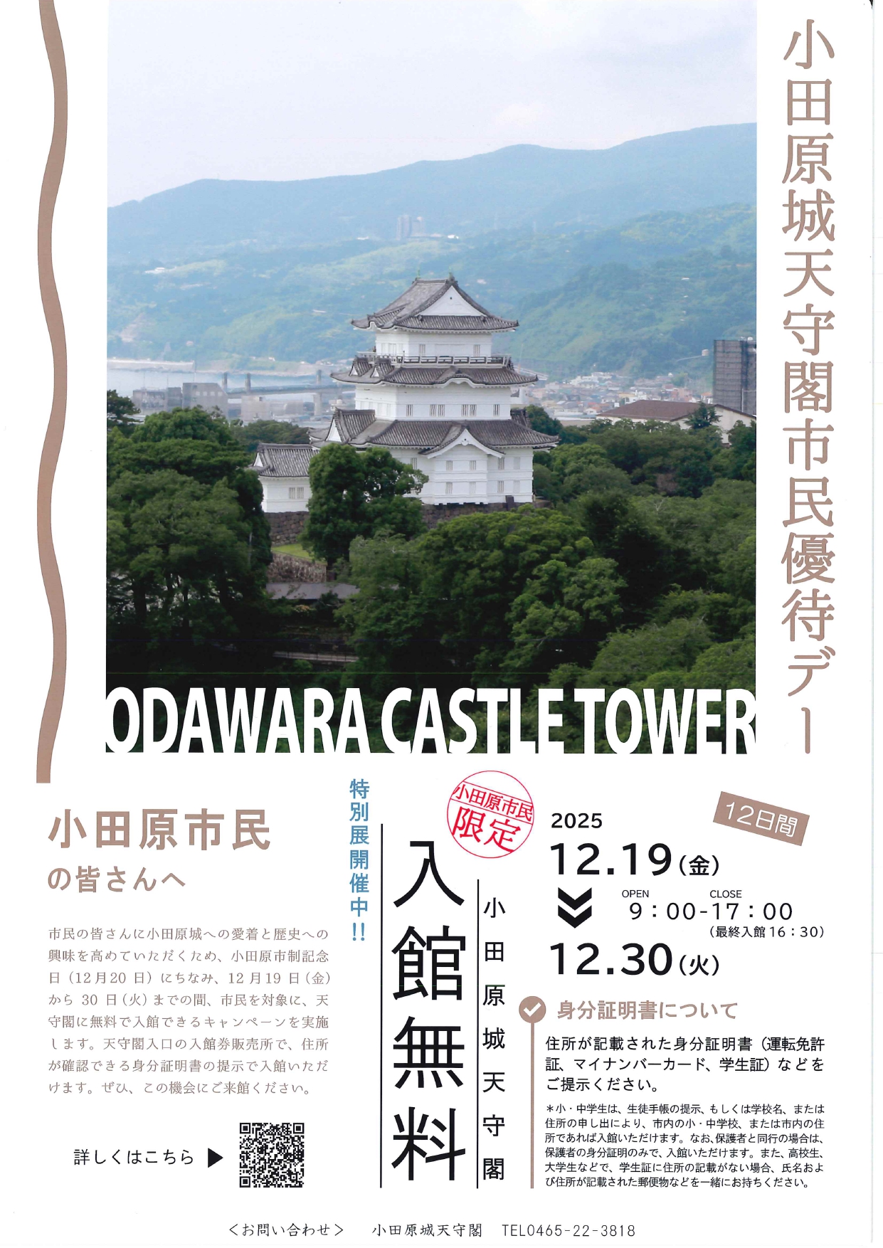 小田原市民の方は、天守閣入館券販売所で住所を確認できる身分証明書の提示などにより、小田原城天守閣に無料で入館いただけます。